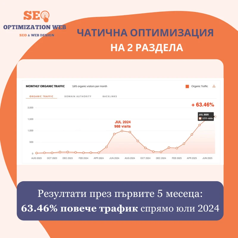 През февруари 2025 г. направихме напреднала SEO оптимизация на два раздела (URL) от уебсайта на наш клиент, който предлага екскурзии с катамаран в Майорка. Тъй като трафикът му обикновено достига своя пик през лятото, сравнихме резултатите със същия период от предходната година. Пет месеца след началото на оптимизацията трафикът на сайта през юли се е увеличил с 63,46% в сравнение с юли миналата година.